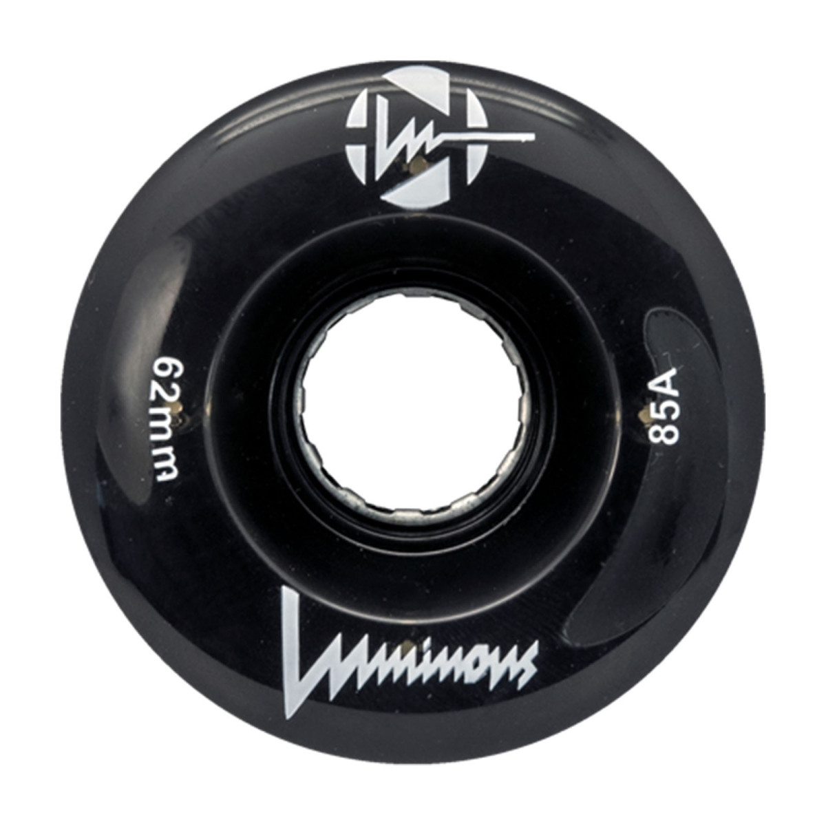 Luminous Quad Wheels in black, measuring 62mm/85A, sold in a pack of 4. These wheels include a magnetic spacer for 8mm axles. Adapters for 7mm and 6mm axles are also available separately. Perfect for both beginner and advanced skaters.