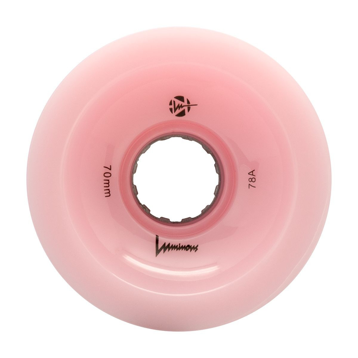 Luminous Longboard Wheels in flamingo pink, measuring 70mm/78A, sold in a pack of 4. These wheels include a magnetic spacer for 8mm axles and offer great performance with an added touch of style. Perfect for anyone looking to add vibrant, glowing wheels to their setup.
